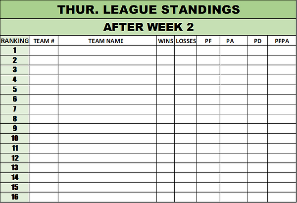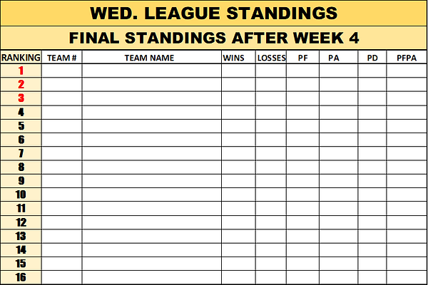 RANKING - Team RANKING is determined by most WINS and most PFs.